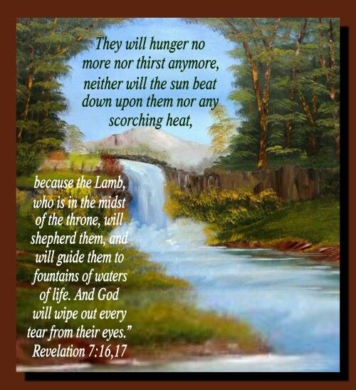 神應許在苦難中的兒女:「他們不再飢,不再渴;日頭和炎熱也必不傷害他們。因為寶座中的羔羊必牧養他們,領他們到生命水的泉源;神也必擦去他們一切的眼淚。」(啟示錄7:16-17)