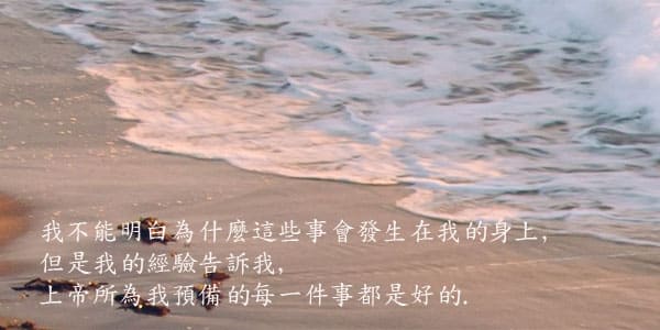 當我回想時,上帝總是讓我為祂的每一樣安排而感謝不已。祂沒有一下子讓我看見祂整個的藍圖, 但是祂一步一步地帶領我, 讓我的視野逐漸開展。我雖然還不能完全領略到祂在我身上的計劃與安排,但是我相信,總有一天,祂會讓我明白祂純全而美好的旨意;那時我將會因祂奇妙的作為而發出無比的讚歎!